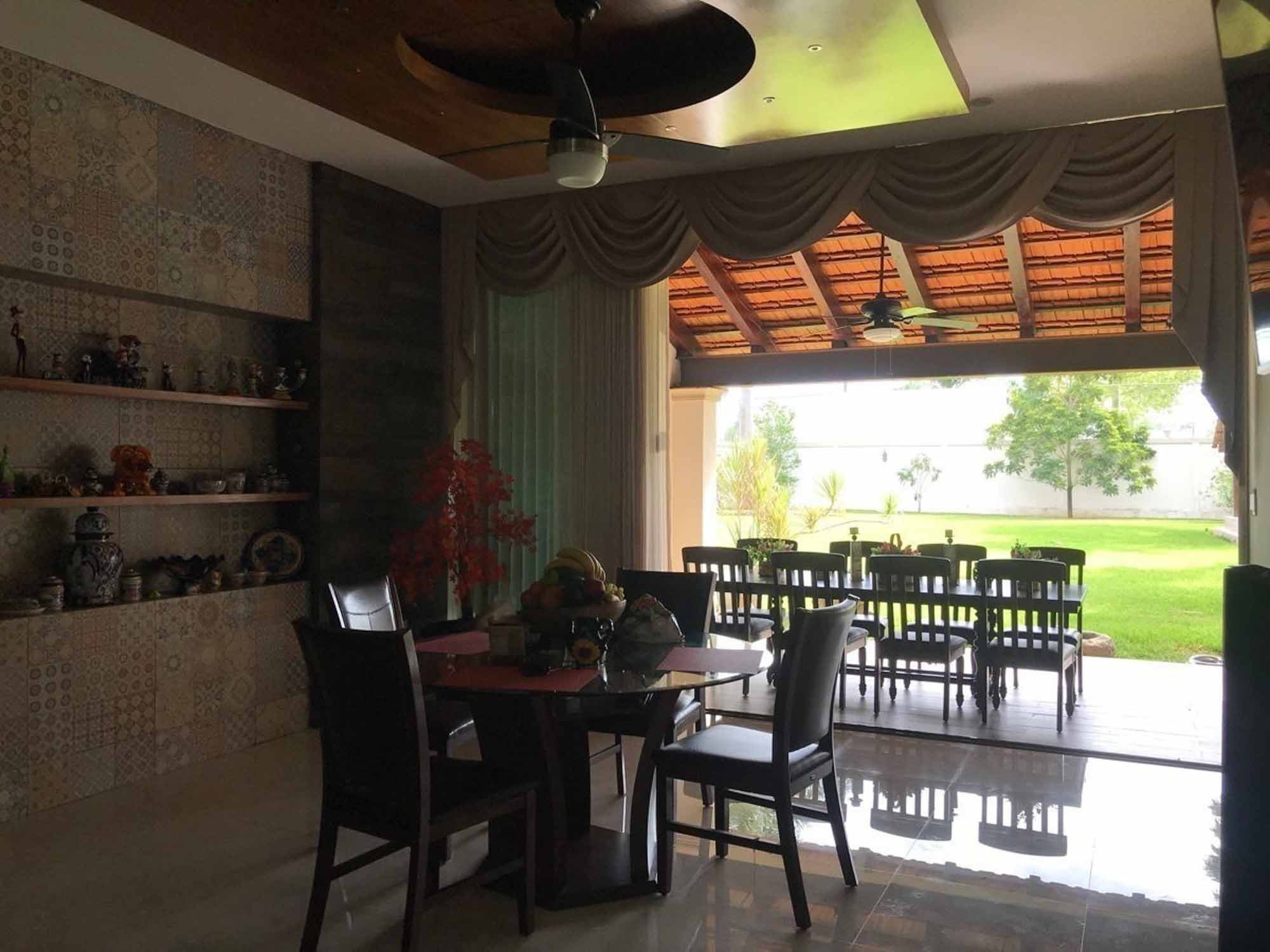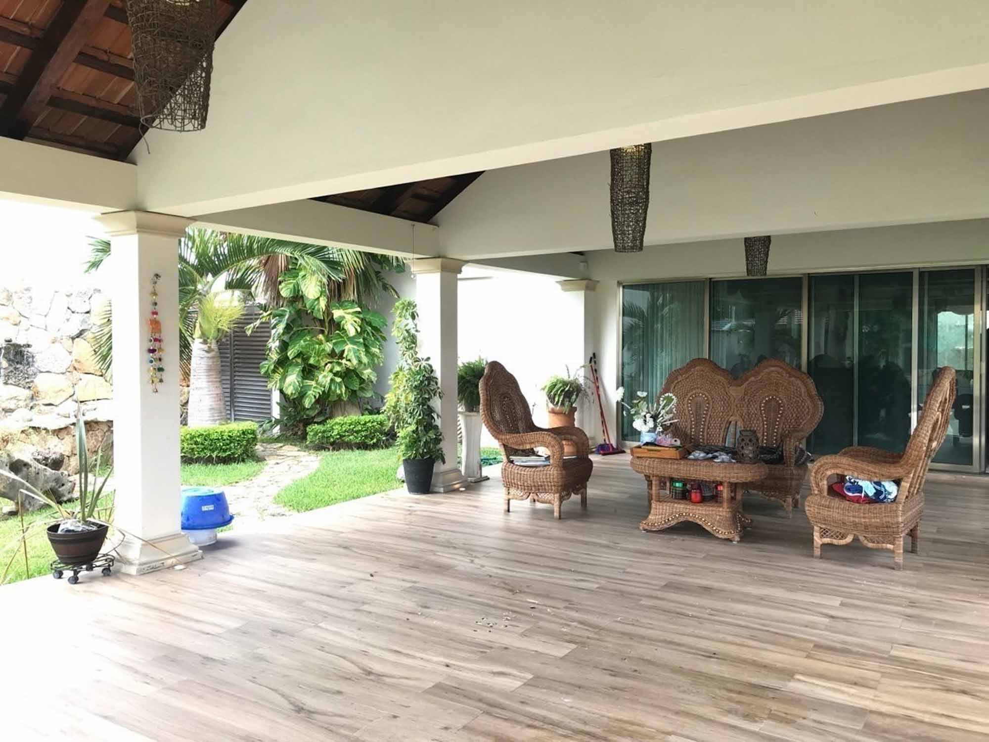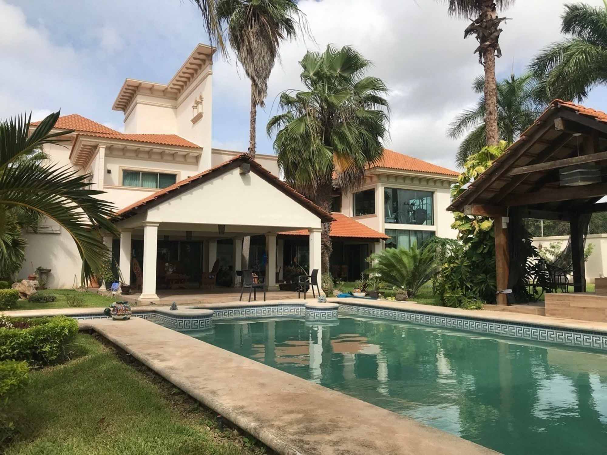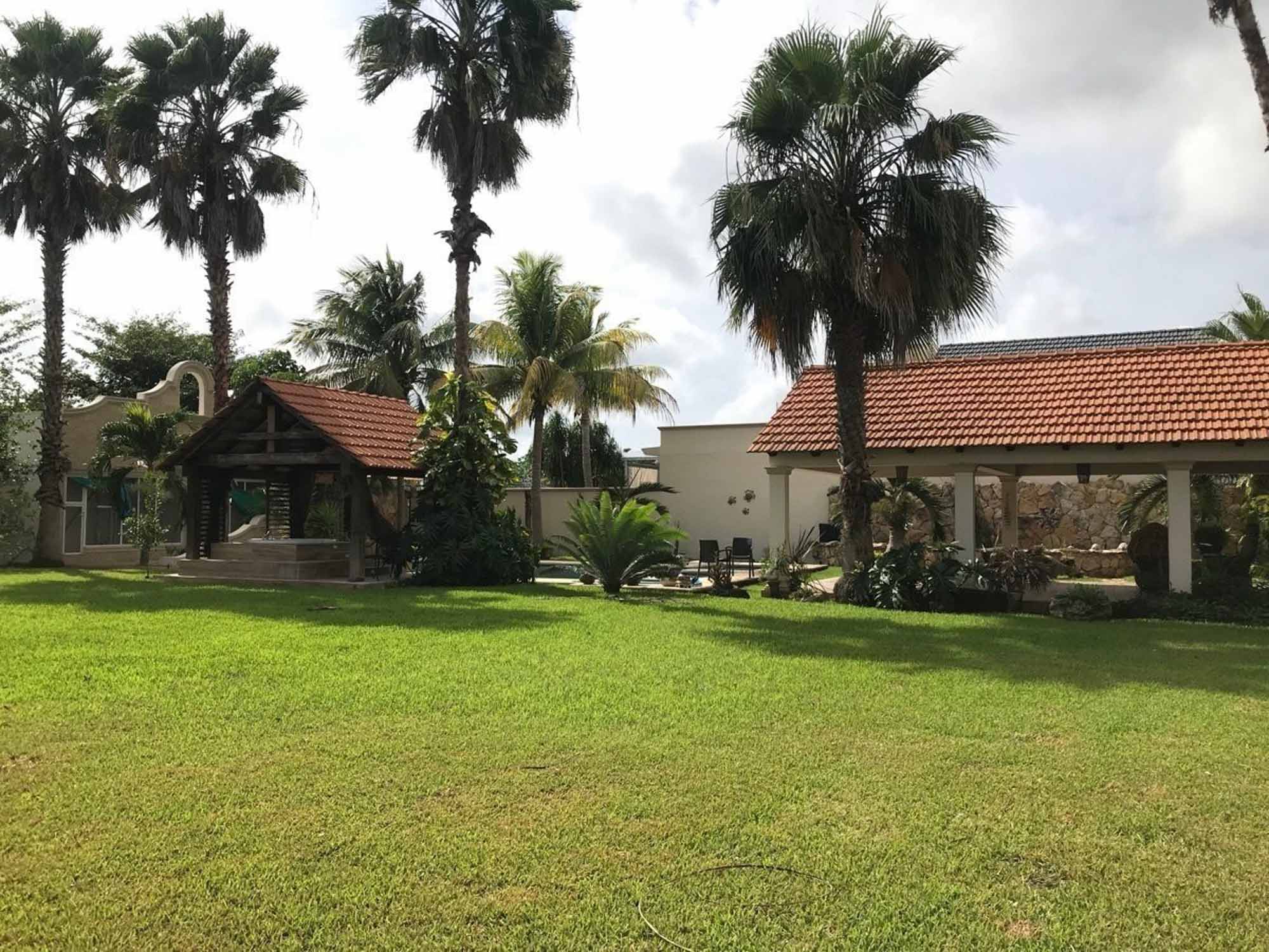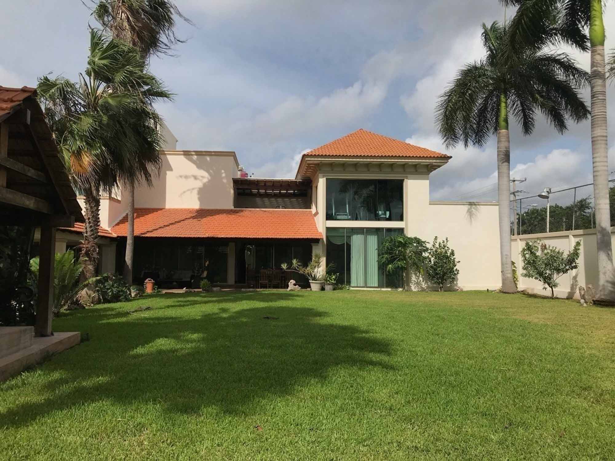 Dos terrazas techadas que se incorporan a la casa por medio de amplios ventanales, jardines con palmeras reales y plantas de ornato, jacuzzi, alberca semiolimpica , baño, asador, jaula de aves, estanque de peces y tortuguero con hermosa cascada de piedra e iluminación.