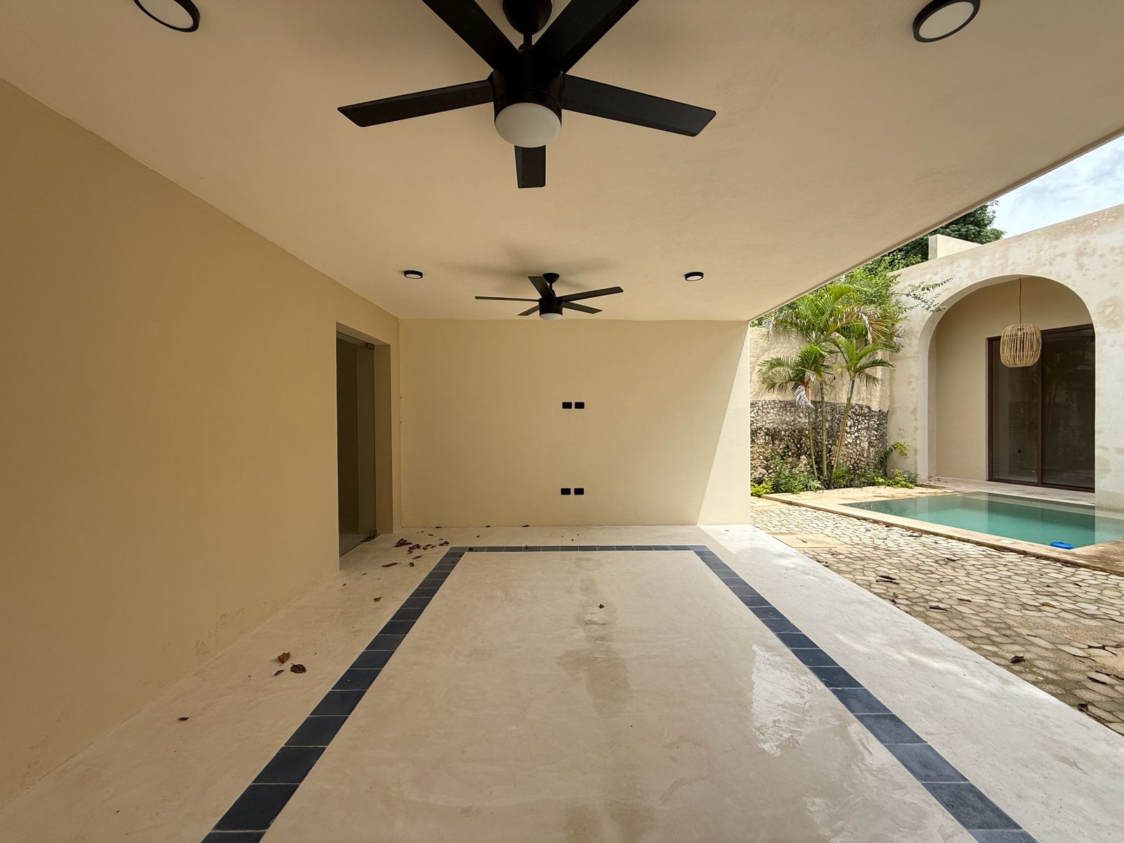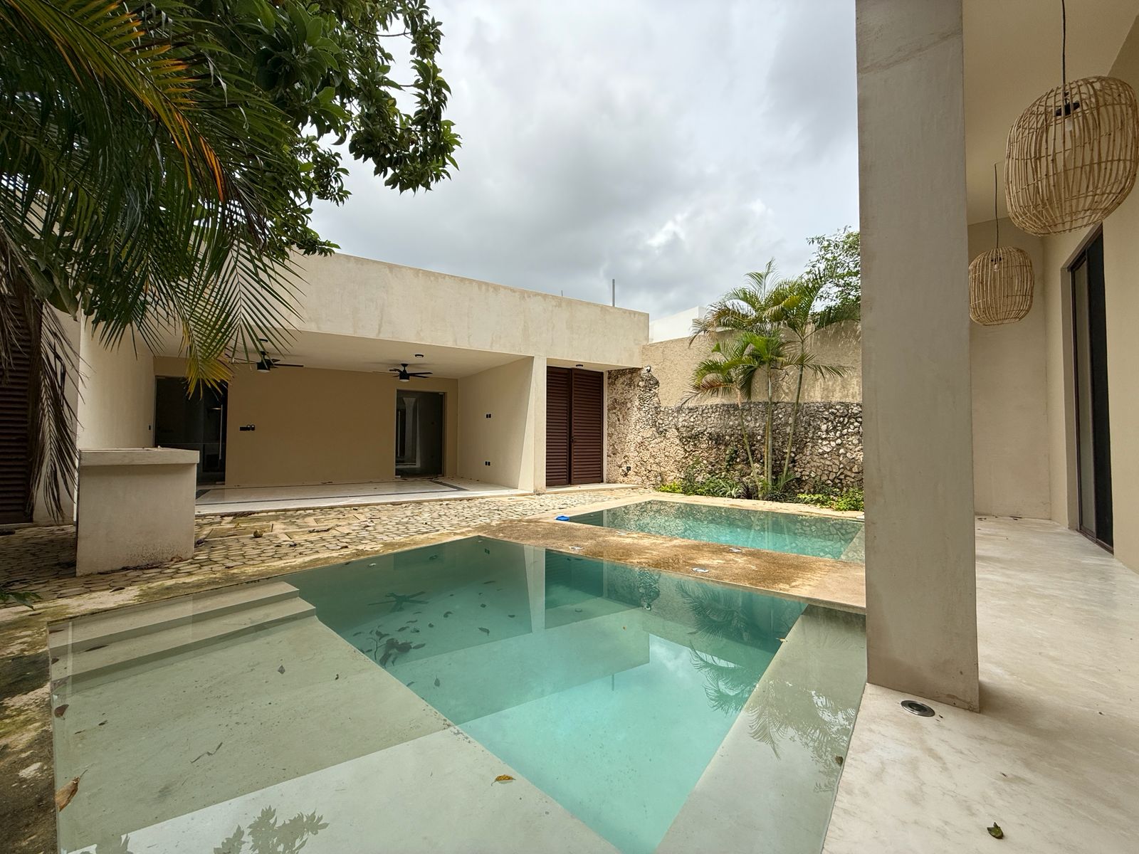 En el centro de la propiedad, hay un patio, una gran piscina filtrada con área de estar y una terraza cubierta.