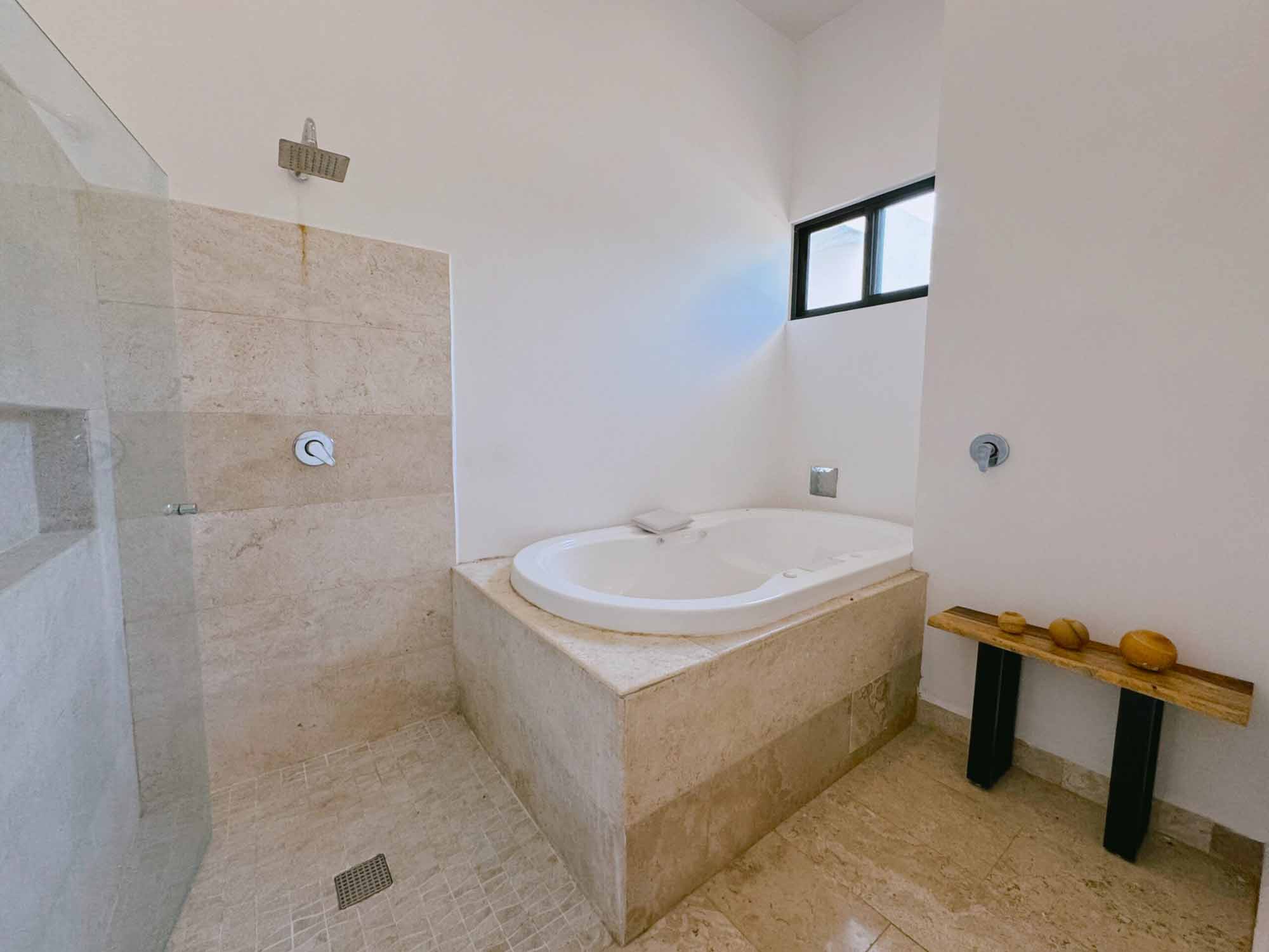 Recámara estilo suite principal con amplio closet vestidor, amplio baño con tina y balcón.