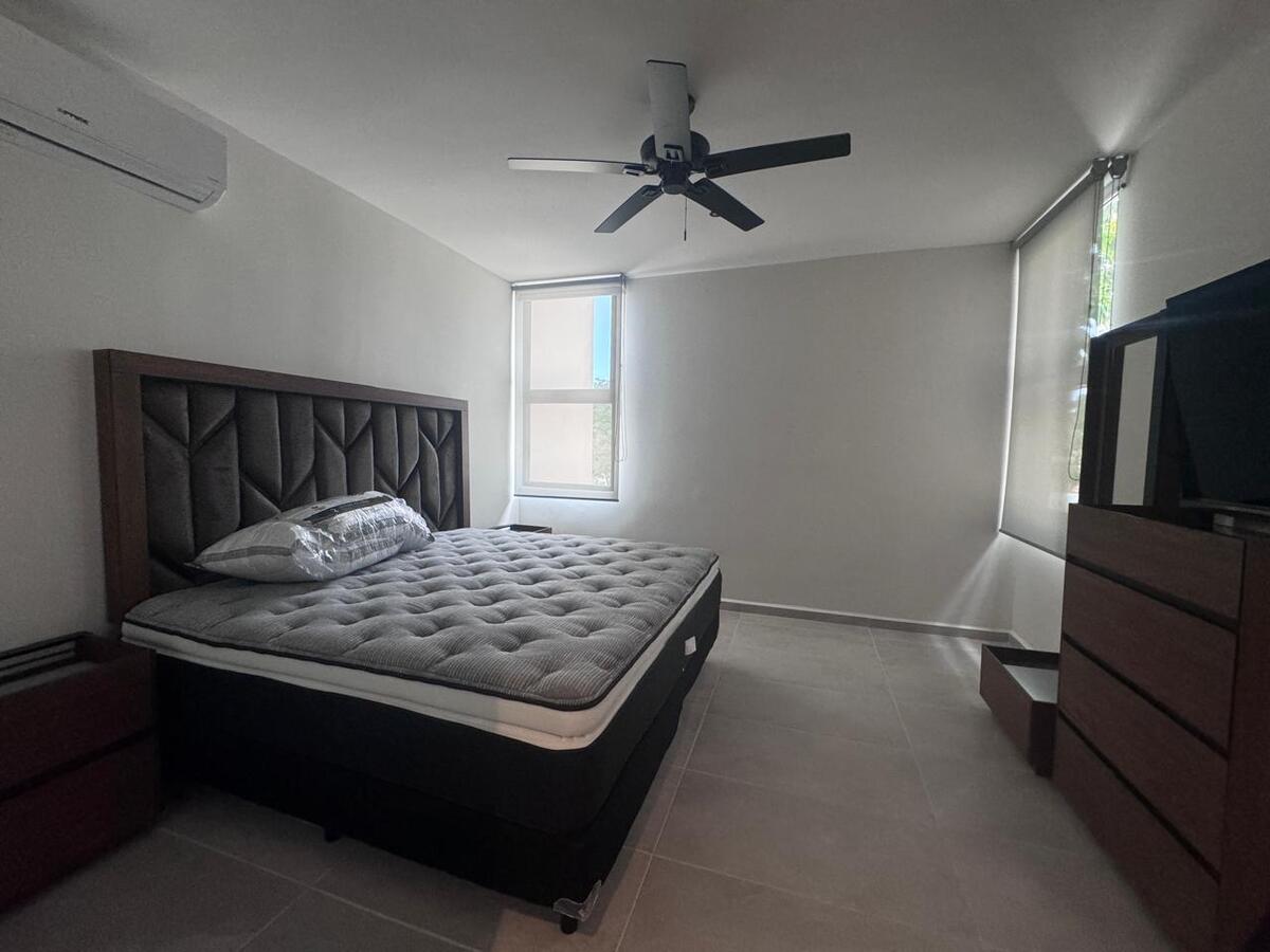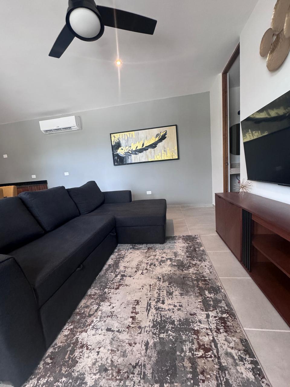 sala tipo L con sofá cama, comedor de 4 personas en madera, persianas en todas las ventanas y dobles ( black out y traslúcida) en recámara, 2 pantallas smart tv de 55 pulgadas ( en sala y recámara), accesorios como microondas y electrodomésticos en cocina, lavasecadora, ventiladores con control remoto, dos climas inverter de 18 y 24 mil btu, mosquiteros, y mucho más.