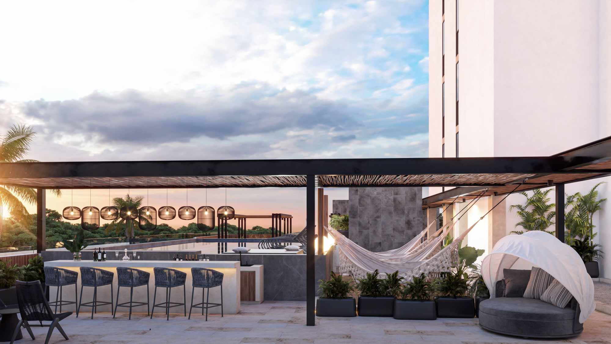 – Terraza, con piscina, y barra de servicio, o ½ baño en área de la terraza.